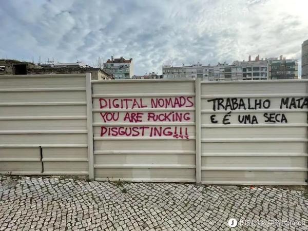 部分生存空间受到挤压的葡萄牙本地低收入群体多次走上街头抗议,甚至有人在当地的墙上看到了“DIGTAL NOMADS YOU ARE FUCK*NG DISGUSTING!!!”(数字游民真TMD恶心)字样的涂鸦。