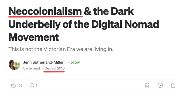这不难理解,早在数字游民运动刚刚兴起的头几年,英文互联网上就有人对此作出过反思,当时他们用的词便是“Neocolonialism”(新殖民主义)。
